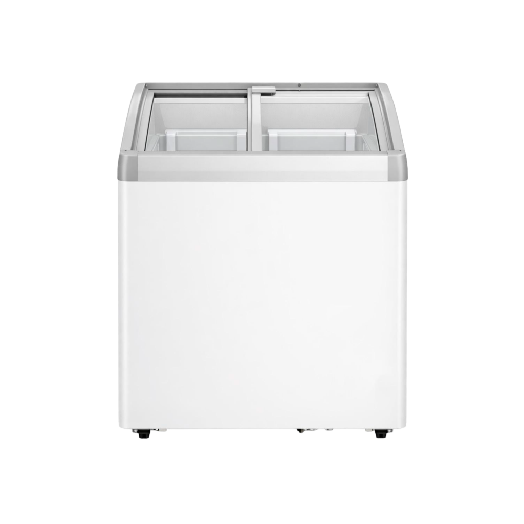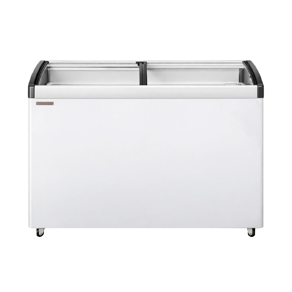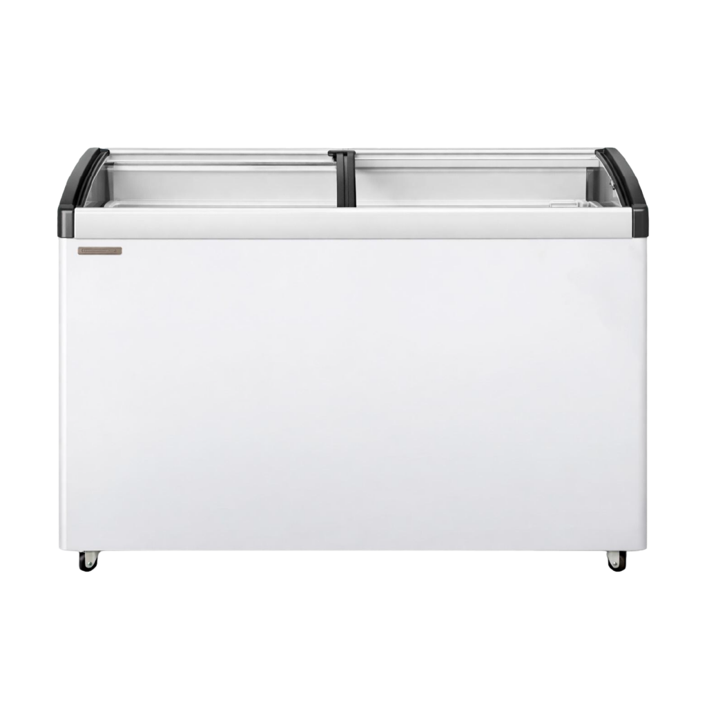 Congelador horizontal tipo vitrina con tapa de vidrio diseñado para la visualización de productos y uso en entornos comerciales.